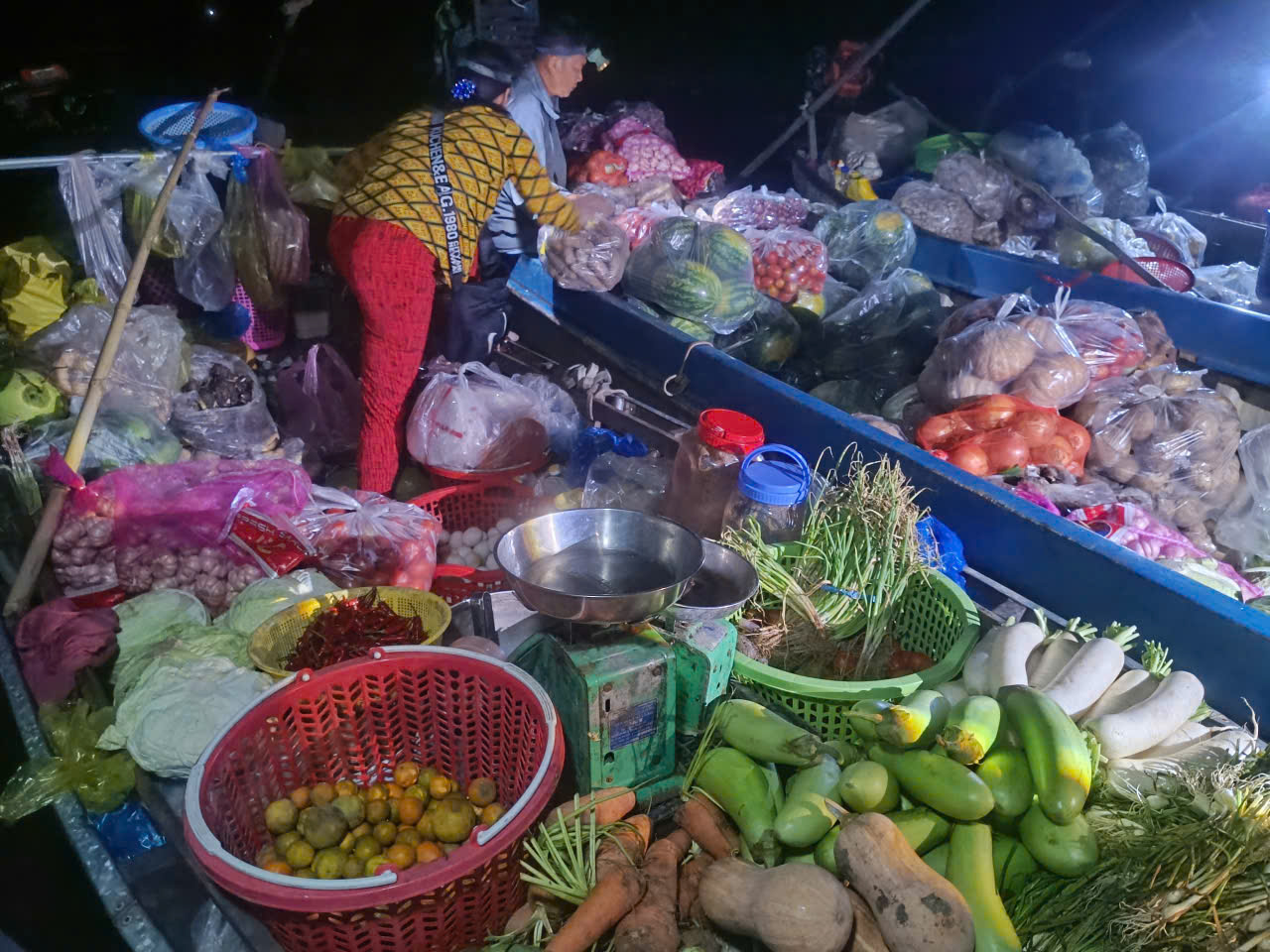 Điểm “lạ” đầu tiên chính là quy mô nhỏ hơn, ghe thuyền không quá dày đặc hiện tại có khoảng từ 5-10 ghe, tàu nhỏ nhưng lại tạo cảm giác gần gũi. Người bán không chỉ buôn trái cây mà còn bán các loại rau, cá đồng nhà trồng, bắt được… tất cả đều diễn ra ngay trên sông, rất chân thực và sống động.