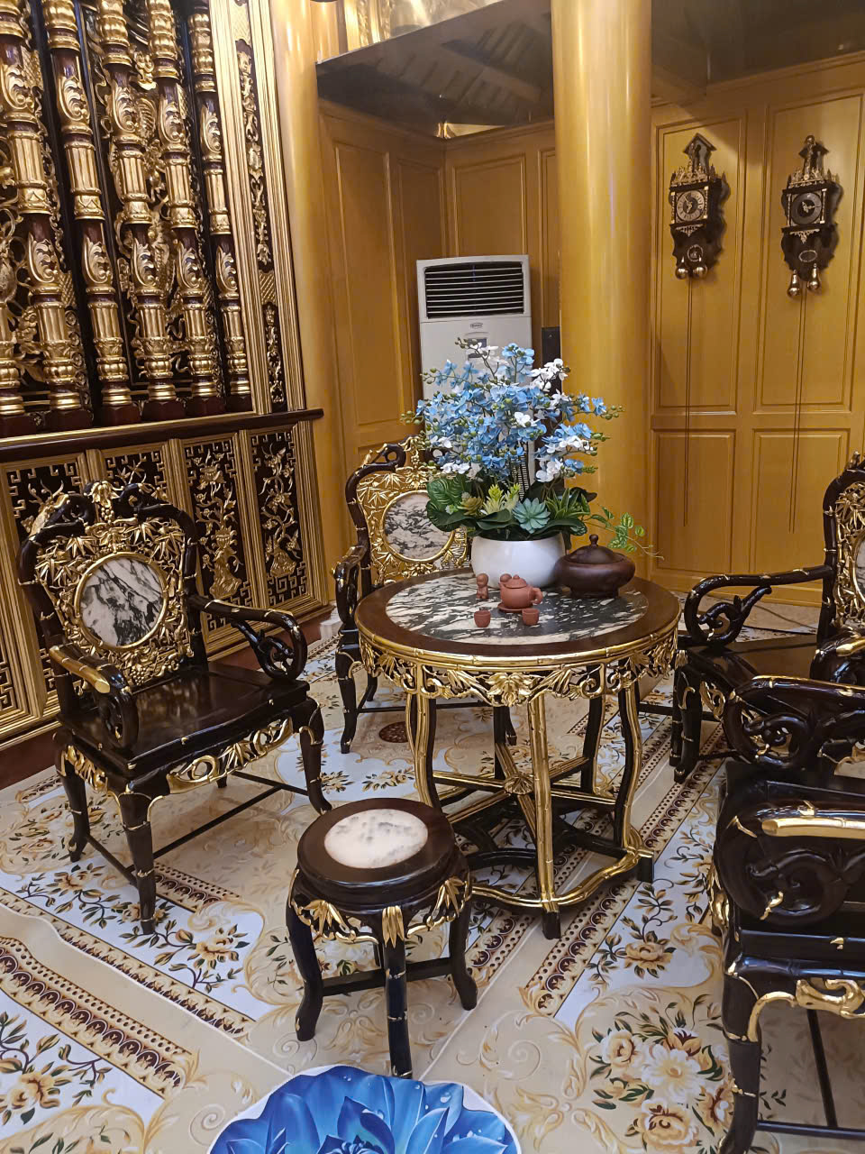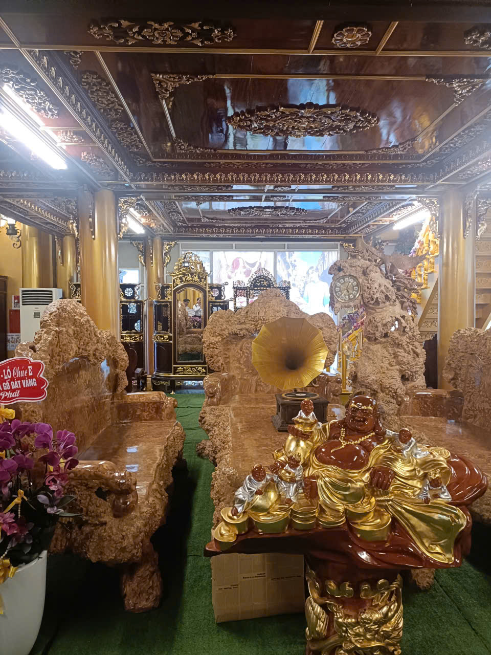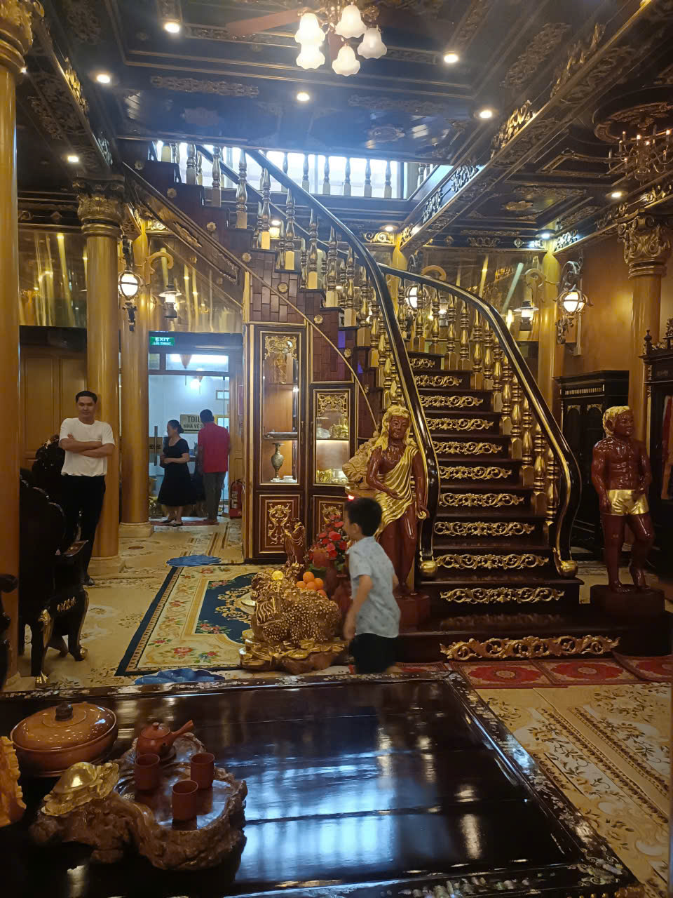 Từ cột, cầu thang, bàn ghế, tủ, giường, tượng đều được dát vàng vô cùng tinh xảo, sang trọng.